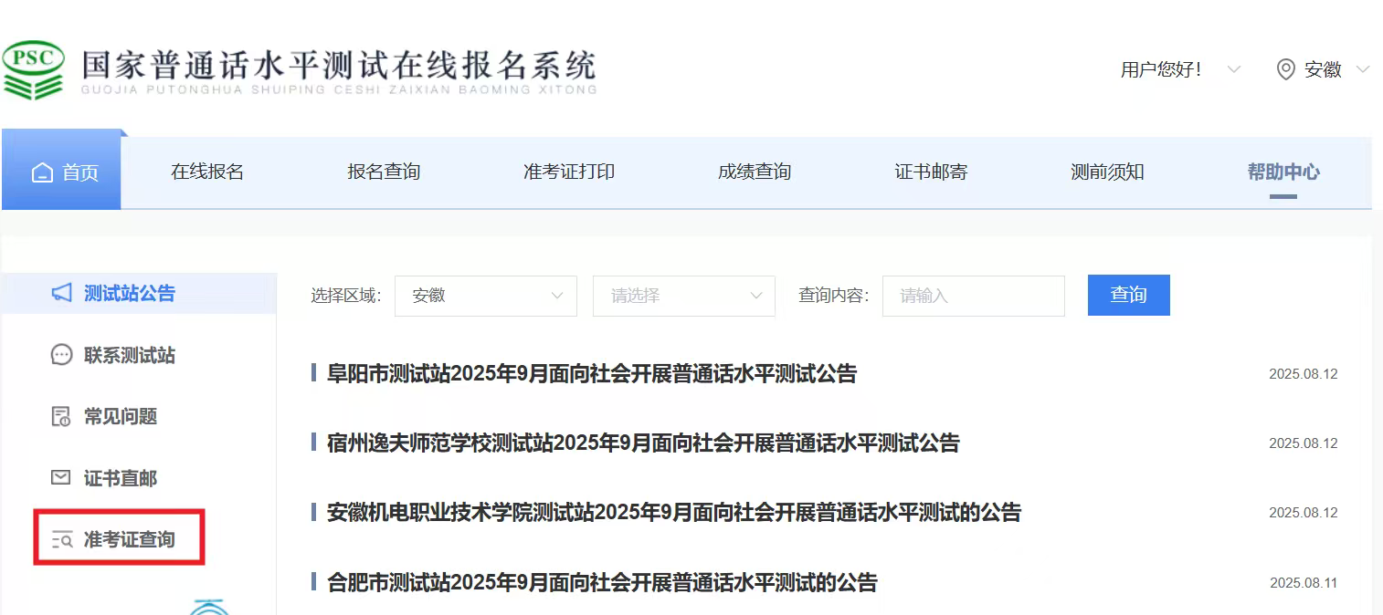 国家普通话水平测试在线报名系统官方网站成绩查询中增加了“准考证号”一项内容,另外考生也可通过报名系统(https://bm.cltt.org/#/index)点击“广西”——用户登录——“帮助中心”栏目下——“准考证查询”的方式,自行查询到本人近3次的准考证信息。